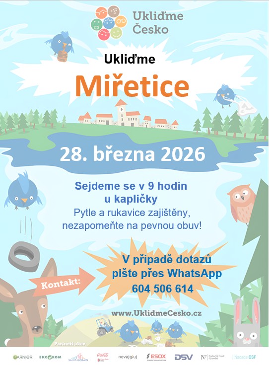Připojte se k nám na úklidovou akci v Miřeticích. Sejdeme se 28. března 2026 v 9 hodin u kapličky. Pytle a rukavice budou zajištěny, nezapomeňte na pevnou obuv. Akce je otevřena pro všechny, kteří chtějí přispět k čistotě našeho okolí. Budeme se těšit.